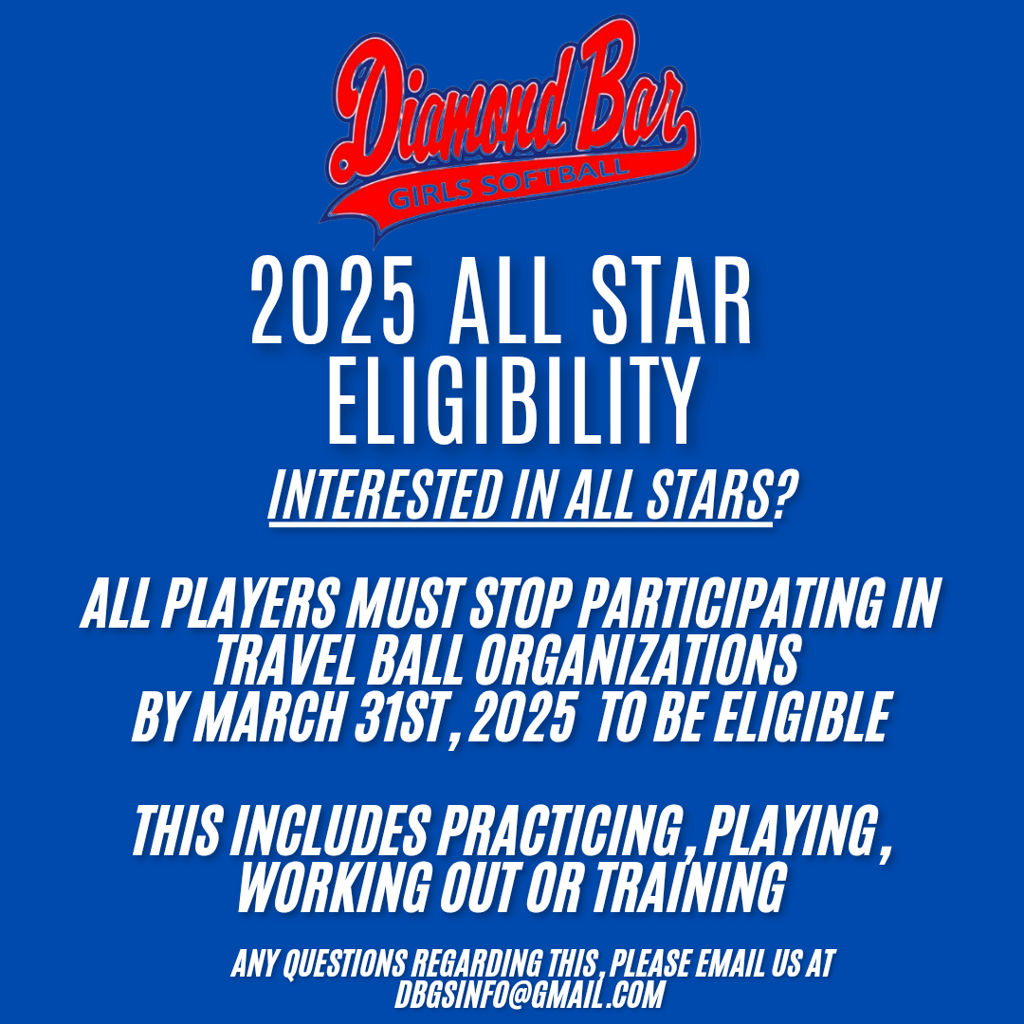 All Stars is much different than our recreational spring program. While our spring season focuses on instruction, development, and improvement, All Stars is about developing advanced skills and a winning attitude in a highly competitive environment. Some players thrive in this environment while others (and/or their parents) do not. It is important as parents to make this distinction for yourselves as well as for your daughter. DBGS is committed to forming the best teams possible that will have the greatest opportunity for success. We will attempt to keep teams small to allow for more playing time. There is no guarantee of playing time or playing a specific position.